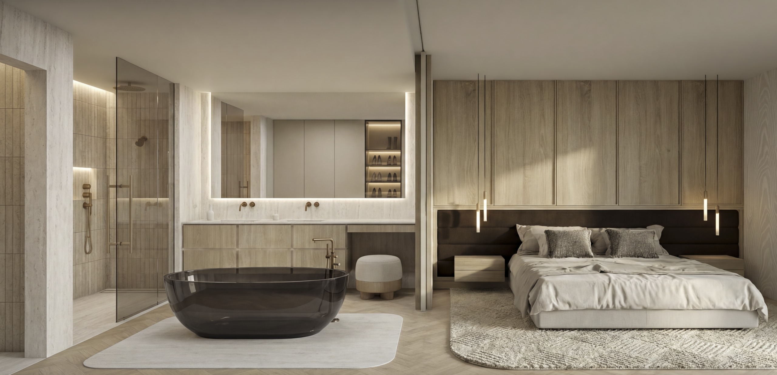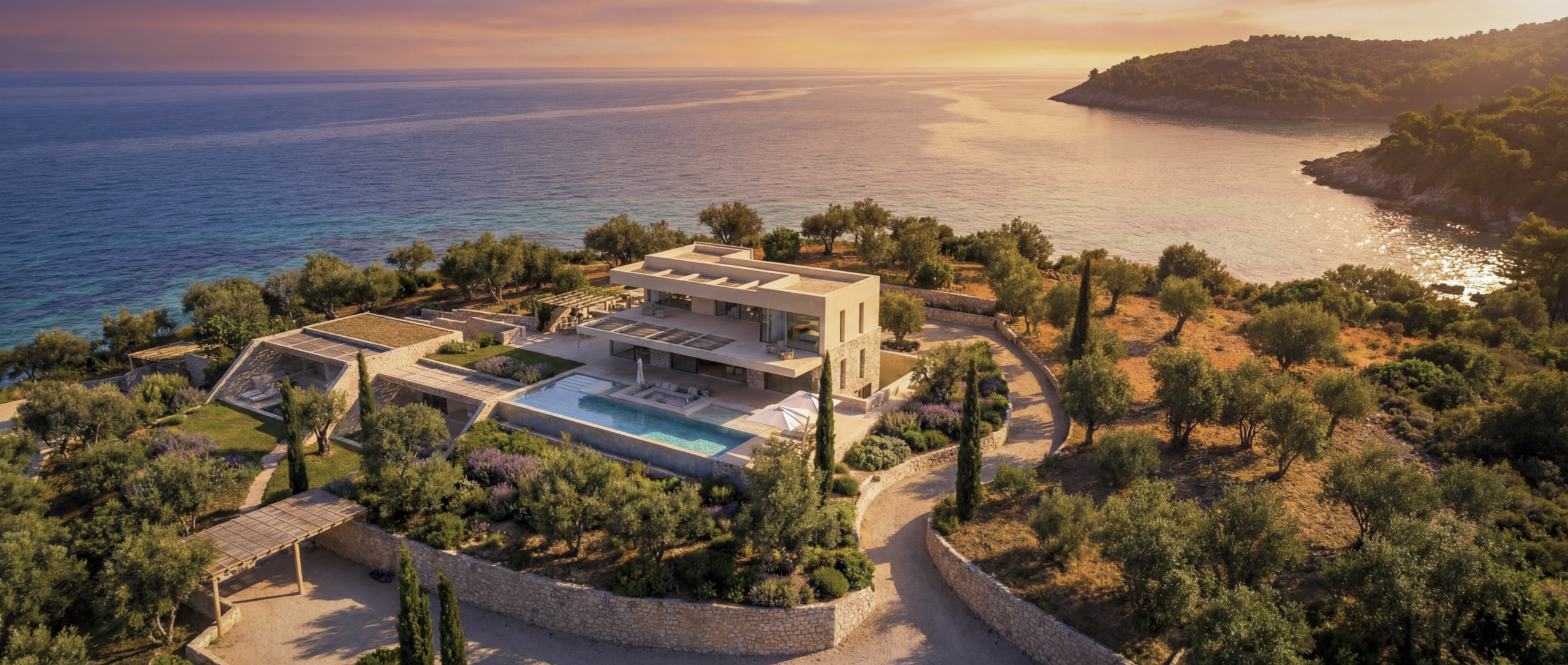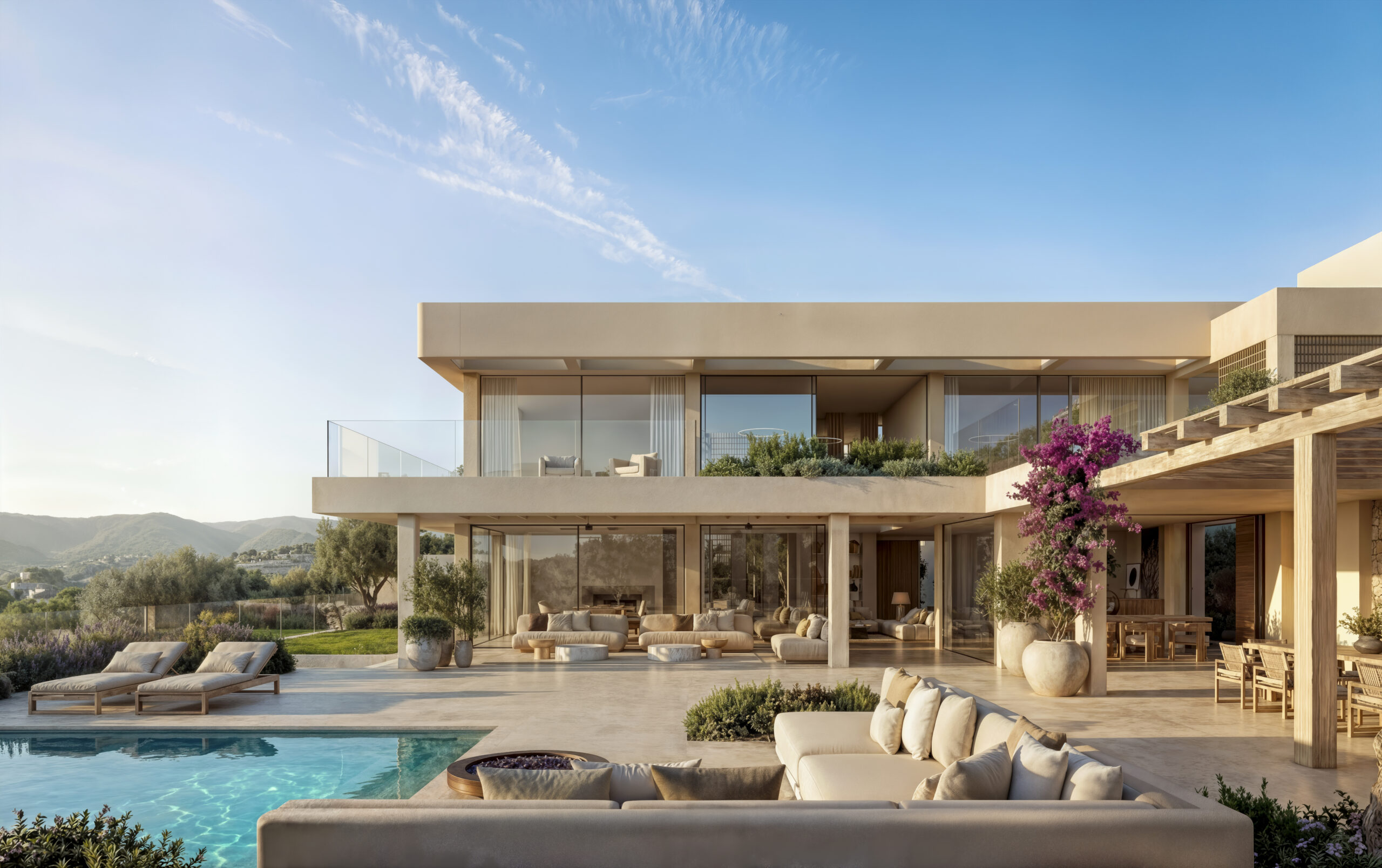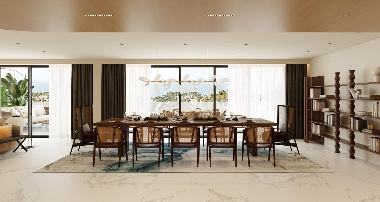 Ground floor will host large living room area and dining space, open kitchen with pantry, WC for guests and a large double height atrium. Moreover ground floor will include two bedrooms with en-suite bathroom and a walk-in closet. Living room and dining space will open to a large exterior space partially covered with pergola in front of a big swimming pool.